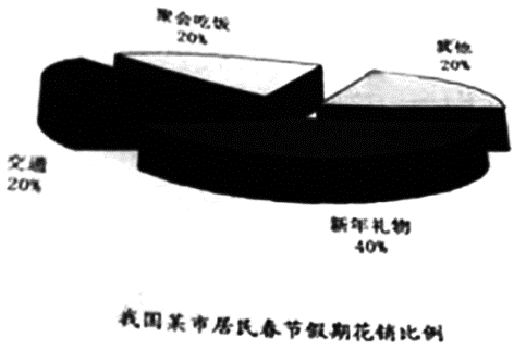The pie chart provides some interesting data regarding the family expense of urban residents during Spring Festival in our country. As is shown above, the family expense during the holiday is mainly used for gifts, accounting 40 percent of the whole expense.