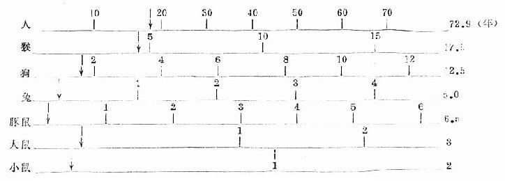 人的寿命较一般实验动物的寿命要长得多,对人体的老化研究,须进行长达70年的现象分析,无疑,采用寿命短的实验动物进行研究是有用的。但象大鼠、小鼠寿命较短,仅2~3年,与人老化过程相比有较大差异,在分析老化本质时应当谨慎。在人工致癌使用大鼠和猴时,达到致癌期需10~12个月时间,对大鼠来说,已占其生命的一半时间,而对猴仅是生命的1/10~1/20。在分析老化和致癌的机制关系上,必须充分考虑。