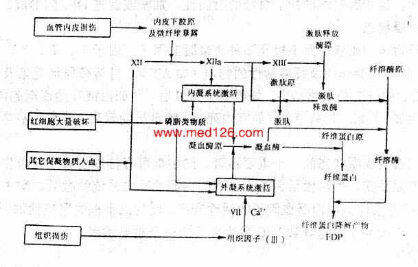 一定量的羊水、转移的癌细胞或其它异物颗粒进入血液可以通过表面接触使因子Ⅻ活化,从而激活内源性凝血系统。急性胰腺炎时,蛋白酶进入血液能促使凝血酶原变成凝血酶。毒蛇咬伤时,某些蛇毒如蝰蛇的蛇毒含有一种蛋白酶,它可直接水解凝血酶原形成凝血酶。响尾蛇的蛇毒可直接使纤维蛋白原凝固。抗原抗体反应也可以引起DIC,这可能是抗原抗体复合物能激活因子Ⅻ或损伤血小板引起血小板聚集并释放促凝物质(如血小板因子等)所致。补体的激活在DIC的发生发展中也起着重要的作用。有人发现,给正常动物静脉注射内毒素后,出现动脉血压下降,血小板及纤维蛋白原等凝血因子减少;但如事先耗竭动物的补体,然后再注射内毒素,则该动物血压改变不明显,DIC实验室检查的异常变化轻微,存活率比未去除补体的动物高,由此可见补体系统在内毒素引起的的DIC中也起一定的作用。补体系统激活的产物C3a、C5a可引起组织肥大细胞、血液嗜碱性粒细胞的脱颗粒反应,从而释放5-羟色胺、组胺等物质。组胺能使毛细血管、微静脉等部位的血管内皮细胞收缩,内皮细胞之间的裂隙扩大,内皮下的胶原暴露,促使内源性凝血系统激活。此外,补体系统激活后C3b还可通过人单核细胞上的C3b受体而使凝血因子Ⅲ的释放增多。补体系统还能直接或间接地促进血小板释放PF3。医.学.全.在.线.网.站.提供