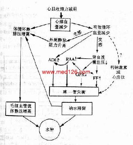 肾小管滤过率下降不一定能单独引起钠水滞留。肾小管重吸收钠水增多是更重要的因素。肾小管重吸收钠水增多的机制是多方面的,首先是由于肾血流减少激活素-血管紧张素系统而使肾上腺皮质球状带分泌醛固酮增多。此外,肝淤血导致肝代谢减弱,以致对醛固酮的灭活减慢,也是使醛固酮增多的一个附加因素。