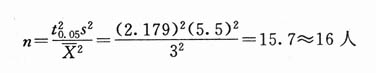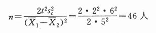 例:有人测定急性克山病患者与克山病区健康人的血磷(mg%),通过预试验已知试验组与对照组均数相差(即X1-X2)为2.5mg%,合并标准差为6mg%,t可以取2(95%正确性),求n等于多少?