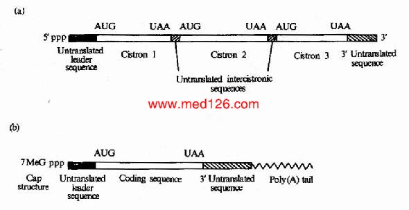 原核细胞中每种mRNA分子常带有多个功能相关蛋白质的编码信息,以一种多顺反子的形式排列,在翻译过程中可同时合成几种蛋白质,而真核细胞中,每种mRNA一般只带有一种蛋白质编码信息,是单顺反子的形式。mRNA以它分子中的核苷酸排列顺序携带从DNA传递来的遗传信息,作为蛋白质生物合成的直接模板,决定蛋白质分子中的氨基酸排列顺序。不同的蛋白质有各自不同的mRNA,mRNA除含有编码区外,两端还有非编码区。非编码区对于mRNA的模板活性是必需的,特别是5’端非编码区在蛋白质合成中被认为是与核糖体结合的部位。见图18-2。