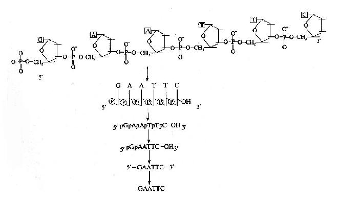 表示一个核酸分子结构的方法由繁至简有许多种(图15-2)。由于核酸分子结构除了两端和碱基排列顺序不同外,其它的均相同。因此,在核酸分子结构的简式表示方法中,仅须注明一个核酸分子的哪一端是5′末端,哪一端是3′末端,末端有无磷酸基,以及核酸分子中的碱基顺序即可。如未特别注明5′和3′末端,一般约定,碱基序列的书写是由左向右书写,左侧是5′末端,右侧为3′末端。