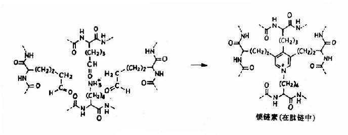 弹性蛋白中疏水性氨基酸含量高达95%,其中有许多是甘氨酸、脯氨酸和亮氨酸。弹性蛋白初合成时为水溶性单体,分子量为70000,称为原弹性蛋白(tropoelastin),在修饰中部分脯氨酸羟化生成羟脯氨酸。原弹性蛋白从细胞中分泌出来后,部分赖氨酸经氧化酶催化氧化为醛基,并与另外的赖氨酸的ε-氨基缩合成吡啶衍生物,称为链素(图13-10)。