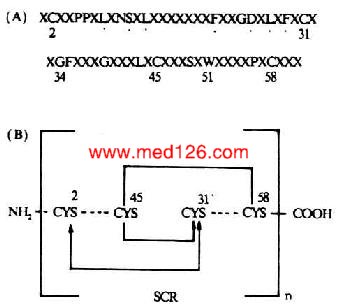补体活化调节蛋白(requlator of complement activation,RCA)包括:CR1、CR2、H因子、C4bp、DAF和MCP。它们共同的结构特征是均具有多个类似的短同源重复序列(SCR)。SCR也称Shushi单位。一个SCR约由60-70个氨基酸残基所组成,大小为4.5nm。SCR之间有20-40%的同源性。所有的SCR均具有固定的保守骨架序列(其中有4个半胱氨酸形成两个二硫键),并与脯氨酸、色氨酸、酪氨酸/丙氨酸、甘氨酸相维系而形成一独特的结构单位(图5-20)。这一结构单位在CR1中有32个,CR2中有15-16个,H因子中有20个,C4b中有12个,DAF和MCP中各有4个,而且是构成这些补体蛋白肽甸的主要结构。SCR在RCA中的功能是与C3、C4和C5结合,发挥其调节作用。在前述的C1r、Cls、C2、Bf、C6和C7中也含有几种非补体性蛋白如IL-2R、β2糖蛋白1(β2-1)、内皮细胞-白细胞粘附分子-1(ELAM-1)、淋巴细胞的归位受体和凝血因子Ⅻ的b亚单位中也含有SCR,但其意义不详。值得注意的是,牛痘病毒具有SCR的编码DNA,且与C4bp的SCR相类似,可逃避补体经典途径对其发挥作用。
