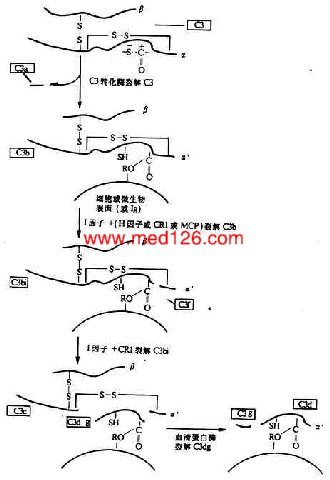 C3处于两条激活途径的汇合点,在补体系统活化过程中起着枢纽作用,并为替代途径激活的关键分子。C3的α、β两条肽链组成,之间以二硫键相连结,分子量为195kDa,其中α链为115kDa,β链为75kDa(图5-6)。其在血清中的含量高于其它补体分子,约为0.55-1.2mg/ml。同C4分子一样,C3分子的α链在半胱氨酸和谷氨酸残基之间也有一个内硫酯键(Cys-S-CO-Glu)。此环状结构水解后,可形成一个转移性结合点,认为这是C3b由液相结合到固相上的结构条件,也是C3以缓慢的速率水解导致其构象改变出现能与B因子具有亲和力的“变构”C3b的分子基础。当C3转化酶从C3α链N端一个精氨酸-丝氨酸键(第77-78位)外将C3裂解后,可产生一个9kDa的小片段C3a(释放到液相中去),其余部分为C3b。同时,新生的C3bα`链内距N端5kDa的硫酯键断裂,在谷氨酰胺基上出现一个具有转酯作用的高度或多糖等分子中的羟基(R-OH)共价结合,形成新的酯键。同样,也可与靶细胞上的氨基形成酰键(-CONH-)。这样,新生的C3b便可结合于靶细胞表面,而其半胱氨酸则通过接受1个质子形成硫氢基(-SH),从而获得转移性。需要提及的是,上述形成的反应性酰基极不稳定,若在60秒内未同碳水化物发生转酯反应,则反应性酰基即与水分子反应形成羧基,从而使C3b失去共价结合的能力(图5-7)。一般细胞表面都有足够的糖类(常以糖蛋白、糖脂或多糖形式存在)因此新生C3b得以通过上述转酯作用而固定于细胞上(外来的或自身的)。通过上述转酯反应而获得结合活性的C3b可与C4b2a结合形成经典途径的C5转化酶(C4b2a3b),或与Bb结合形成替代途径的C3转化酶(C3bBb)和C5转化酶(C 3bnBbC3b也可在H因子和I因子的作用下,变为无活性的C3bi,并再I因子裂解为C3dg和C3c(图5-8)。C3d可能是C3裂解的最终产物,只有在细菌或炎灶分解产物的作用下,才能裂解为C3d和C3c。还报道有C3e片段,可能来源于C3c。医学全在线网站www.med126.com