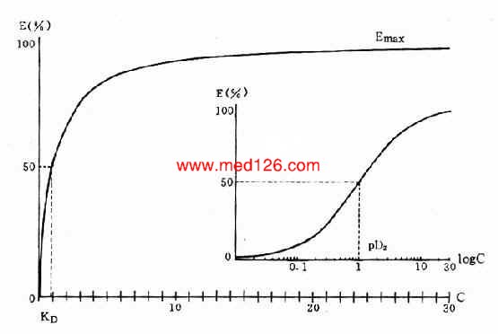 药理效应与剂量在一定范围内成比例,这就是剂量-效应关系(dose-effect rela-tion-ship)。由于药理效应与血药浓度的关系较为密切,故在药理学研究中更常用浓度-效应关系(concentration-effect relationship)。用效应强弱为纵座标、药物浓度为横座标作图得直方双曲线(rectangular hyperbola)。如将药物浓度改用对数值作图则呈典型的对称S型曲线,这就是通常所讲的量效曲线(图2-1)。药理效应强弱有的是连续增减的量变,称为量反应(graded response),例如血压的升降、平滑肌舒缩等,用具体数量或最大反应的百分率表示。有些药理效应只能用全或无,阳性或阴性表示称为质反应(all-or-none response或quantal response),如死亡与生存、抽搐与不抽搐等,必需用多个动物或多个实验标本以阳性率表示。用累加阳性率对数剂量(或浓度)作图也呈典型对称S型量效曲线(图2-2)。