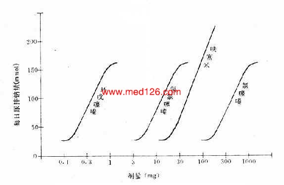 从上述两种量效曲线可以看出下列几个特定位点:最小有效浓度(minimum effective concentration),即刚能引起效应的阈浓度(threshold concentration)。如果横座标用剂量表示,将“浓度”改为“剂量”即可,下同。半数有效量(median effective dose)是能引起50%阳性反应(质反应)或50%最大效应(量反应)的浓度或剂量,分别用半数有效浓度(EC50)及半数有效剂量(ED50)表示。如果效应指标为中毒或死亡则可改用半数中毒浓度(TC50)、半数中毒剂量(TD50)或半数致死浓度(LC50)、半数致死剂量(LD50)表示。继续增加浓度或剂量而效应量不再继续上升时,这在量反应中称为最大效能(maximum efficacy),反映药物的内在活性。在质反应中阳性反应率达100%,再增加药量也不过如此。如果反应指标是死亡则此时的剂量称为最小致死量(minimum lethal dose)。药物效应强度(potency)是指能引起等效反应(一般采用50%效应量)的相对浓度或剂量,反映药物与受体的亲和力,其值越小则强度越大。药物的最大效能与效应强度含意完全不同,二者并不平行。例如利尿药以每日排钠量为效应指标进行比较氢氯噻嗪的效应强度大于呋塞米,而后者的最大效能大于前者(图2-3)。药物的最大效能值有较大实际意义,不区分最大效能与效应强度只讲某药较另药强若干倍是易被误解的。量效曲线中段斜率(slope)较陡的提示药效较激烈,较平坦的提示药效较温和。但在质反应曲线,斜率较陡的曲线还提示实验个体差异较小。曲线上的每个具体数据常用标准差(standard deviation)表示个体差异(individual variation)。