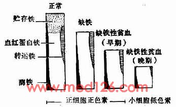 缺铁时,首先含铁血黄素和铁蛋白在骨髓和其他贮存处消失。许多其他重要的铁蛋白活性减低,如细胞色素C、细胞色素氧化酶、琥珀酸脱氢酶、乌头酸酶、黄嘌呤氧化酶、肌红蛋白等,因此在缺铁时,许多组织细胞代谢和机能发生紊乱。胃粘膜分泌盐酸常减少。43%缺铁患者空腹组织胺试验显示胃酸缺乏。尚不知胃酸缺乏是铁吸收不良的原因,还是缺铁是萎缩性胃炎和胃酸缺乏的原因。神经系统机能障碍,缺铁的患者单胺氧化酶活性减低,可导致神经和智力发育损害。医学 全在.线提供www.med126.com