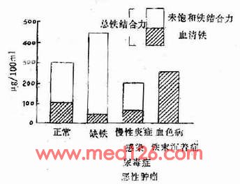 缺铁性贫血时血清铁常低于10.74umol/L(60ug/100ml),总铁结合力增高,高于64.44umol/L(360ug/100ml),血清铁饱和度减少,低于15%(图5―2-3)。
