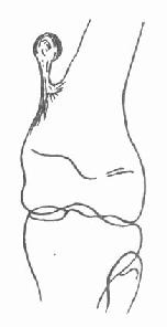 X线表现为骨性病损自干骺端突出,一般比临床所见的要小,因软骨帽和滑囊不显影,肿瘤的骨质影像与其所在部位干骺端的骨质结构完全相同。不易区别。位于长骨的肿瘤其生长方向与邻近肌肉牵引的方向一致,例如股骨远端的骨软骨瘤向股骨的生长,胫骨近端的肿瘤向胫骨远端生长。其形状不一,可有一个很长的蒂和狭窄的基底(图3-230)。或很短粗呈广阔的基底,较大的肿瘤其顶端膨大如菜花。