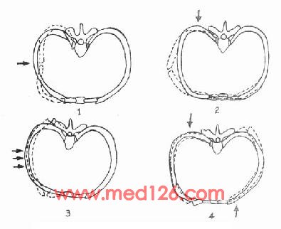 1.在着力点处;2.胸腔受前后压力压迫时;3.受到来自侧方的力压迫时;4.受左右交错的压力压迫时。