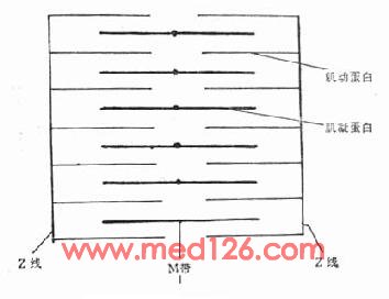 肌凝蛋白的端部固定在M带上,不论心肌是处于休止状态,或者是收缩状态,它的位置不变。而肌动蛋白则可以滑动,肌纤维在休止状态时,它远离开M带而滑动;当收缩时则向M带滑动,使肌节缩短。