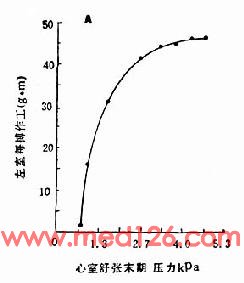 通常我们称心脏的功能,即指心脏的作工能力的大小,图2-7示心室每搏的作工和心室舒张末期压力的关系。心室腔内压力的大小对心肌耗氧量的重要性更为突出,心室肌收缩产生压力所耗的氧比起排血所需氧要大得多。