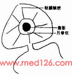 病理基础为粘膜面溃烂的溃疡;或因局部管壁结构薄弱和邻近病变的粘连牵拉,致使该部各层向腔外突出的憩室。溃疡(图5-8)或憩室(diverticulum)都可使钡剂充填。如果X线从凹陷区的侧面投影(切线位投影),就在轮廓线外形成一个突出的钡影,例如胃溃疡所造成的胃轮廓线外的突出影。x 线术语称之为龛影或壁龛(niche or crater):而憩室突出影则称之为袋影突出。在正面像上为园形或椭园形的钡斑影。有时龛影周围所形成环形透光影,是溃疡周围的粘膜炎性肿胀所致,X线称为月晕征(图5-9)