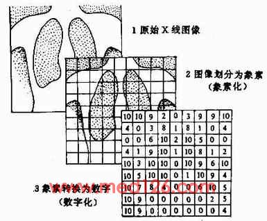 数字矩阵可为256×256、512×512、或1024×1024。象素越小、越多,则图像越清晰。如将数字矩阵的数字经数字/模拟转换器转换成模拟图像,并于影屏上显示,则这个图像就是经过数字化处理的图像。