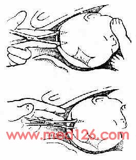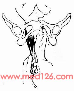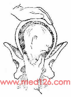 (三)牵引 仔细检查,避免夹住产道软组织。然后顺产轴缓缓牵出胎儿。一手应始终置儿头周围,以防破碎颅骨损伤软产道。