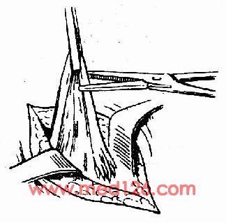 (二)牵出输卵管 进腹腔后,用小拉钩牵开切口,用无齿环钳沿子宫后壁伸向一侧输卵管的所在部位(图191),夹住输卵管牵出切口外。有时很易取出,有时须几经反复才能找到。必要时伸入食指,指引取出。操作要轻柔,勿用力牵拉。必须追踪见到伞端(图193)后才能结扎,以防误扎。如在产后手术,可将宫体推向一侧,以利寻夹输卵管。平时手术,有时子宫位置较深,可由助手在阴道后穹窿将子宫托起,以便操作。寻找输卵管遇大网膜肠管挡住时,可轻轻塞入一纱布,将其推开。医学全在.线www.lindalemus.com