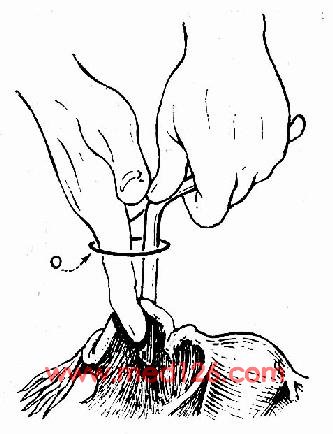 近多有用“指板法”取管者,熟练后可较快取出输卵管,系用一如指宽的金属板和指食同时伸入盆腔,扪到输卵管后将之夹出(图192)。