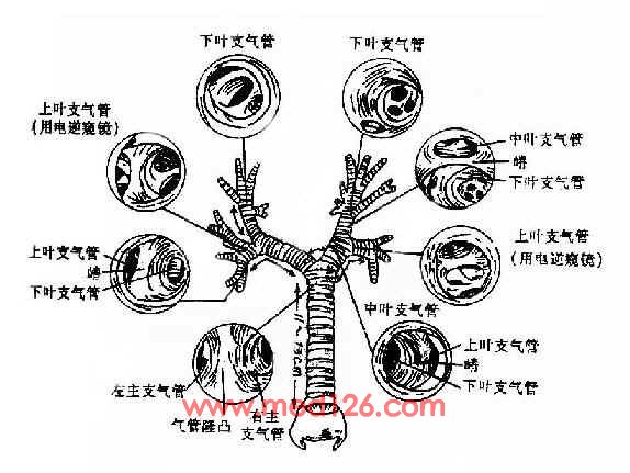 支气管(bronchi)分左右主支气管。右支气管较短而粗,长约2.5cm,直径约1.4~2.3cm,与气管纵轴的延长线约成20°~30°角;左支气管较细而长,长约5cm,直径约1.0~1.5cm,与气管纵轴成40~45°角,因此气管异物进入右侧的机会较左侧多见,右侧支气管约在第5胸椎下缘进入肺门,分为三支进入各相应的肺叶,即上叶、中叶和下叶支气管;左侧支气管约在第6胸椎处进入肺门,分为上、下叶支气管。
