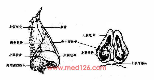 外鼻软骨性支架:由鼻中隔软骨(septal cartilage)、侧鼻软骨(lateral nasal cartilage)、大、小翼软骨(alar cartilage)等组成。各软骨之间为结缔组织所联系。