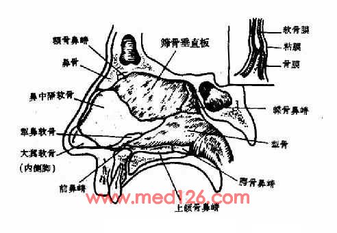 鼻腔(nasal cavity)为一顶窄底宽的狭长腔隙,前起前鼻孔,后止于后鼻孔,与鼻咽部相通。同鼻中隔分隔为左右两腔,每侧鼻腔包括鼻前庭及固有鼻腔两部分。医学全在线www.med126.com