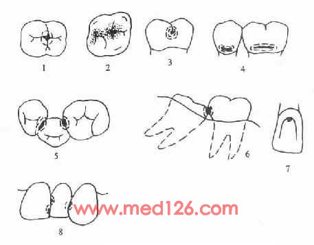 6.因阻生牙而致的邻面龋 7.前牙舌面窝龋 8.前牙邻面龋