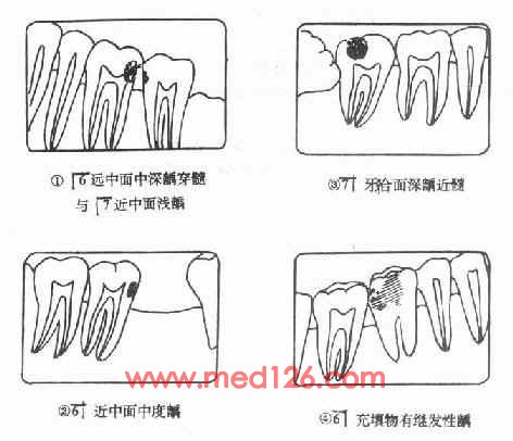多见于龋病治疗过程中龋坏组织未去净化或修复体边缘不密合,形成裂隙以致再次发生龋坏(图3-4)。