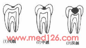临床上可见龋齿有色、形、质的变化,而以质变为主,色、形变化是质变的结果,随着病程的发展,病变由釉进入牙本质,组织不断被破坏、崩解而逐渐形成龋洞,临床上常根据龋坏程度分为浅、中、深龋三个阶段,各自表现如下,(图3-3,3-4)