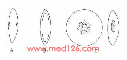 2.极性白内障(polar cataract)分前极和后极两种。分别位于视轴区前后囊,为局限性混浊,静止性,后极性混浊对视力影响较大(图9-5A)。