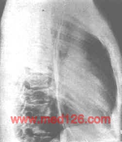 纵隔支气管囊肿。胸片正位(上图)示肿块位于右侧纵隔,贴于主动脉弓及右心缘。侧位(下图)示肿块主要位于中纵隔中部,重叠于心影上。