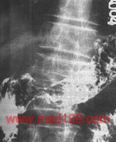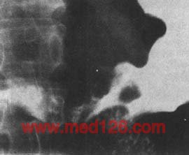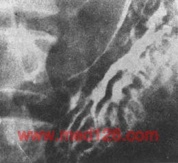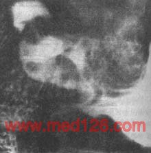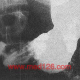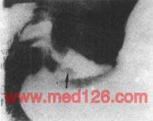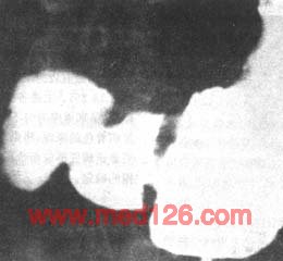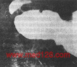1.早期胃癌的X线表现 在适当加压或双重对比下,隆起型常显示小的充盈缺损,表面多不光整,基部稍宽,附近粘膜增粗、紊乱,可与良性息肉鉴别(图4)。
