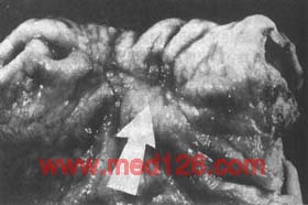 (3)浸润型:此型也分为两种,一种为局限浸润型,癌组织浸润胃壁各层,多限于胃窦部,浸润的胃壁增厚变硬,皱壁消失,多无明显溃疡和结节。浸润局限于胃的一部分者,称“局限浸润型”。另一种是弥漫浸润型,又称皮革胃,癌组织在粘膜下扩展,侵及各层,范围广,使胃腔变小,胃壁厚而僵硬,粘膜仍可存在,可有充血水肿而无溃疡。