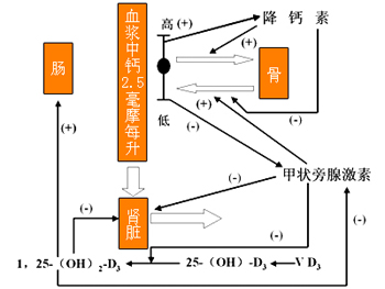 PTH、1,25-(OH)2-D3和降钙素对血钙的调节作用及其相互关系见图。
