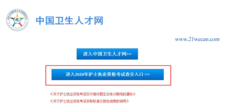 登录“中国卫生人才网”网站,点击进入“2020年护士执业资格考试成绩查询入口”。