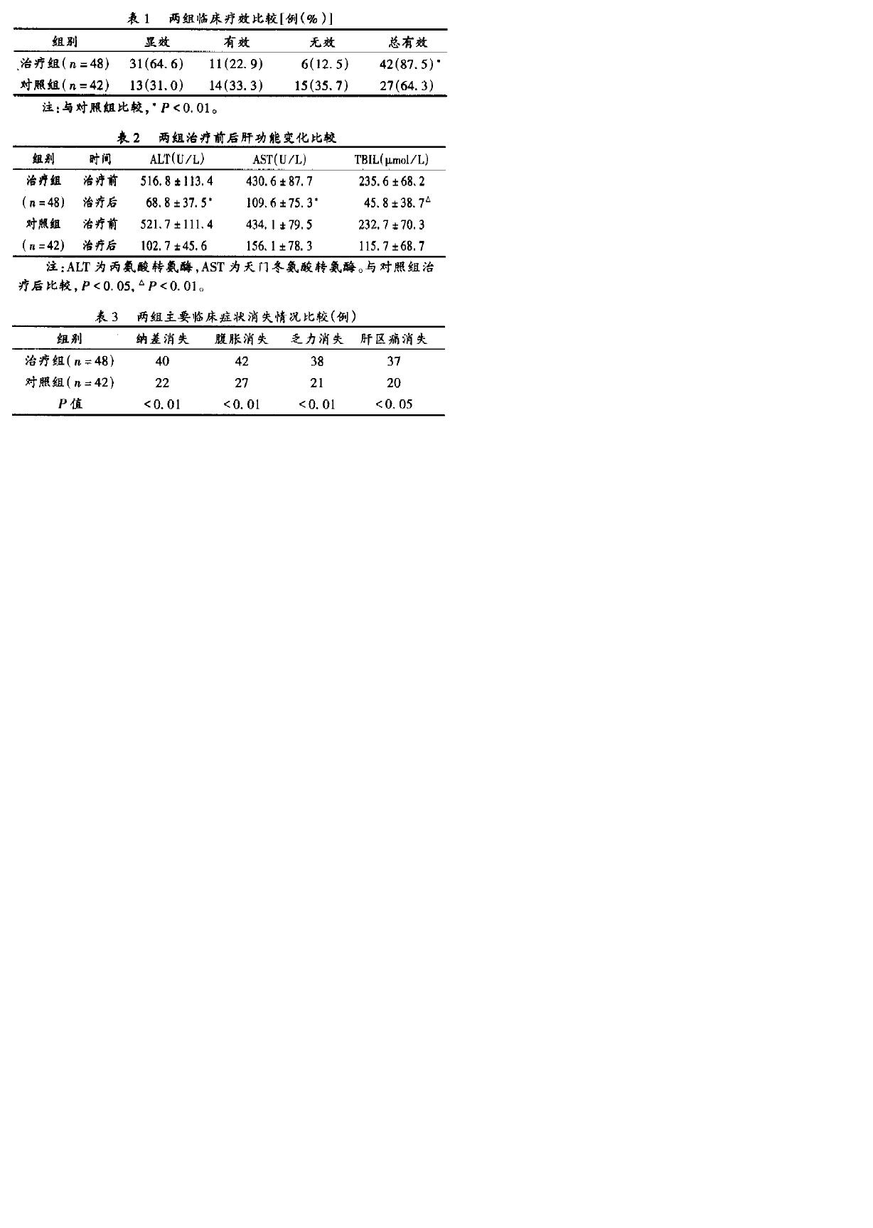 | 疗效评价标准 | 参照1990年5月上海第5次全国病毒性肝炎会议制订的诊断治愈标准判断。显效:疗程结束时,临床症状消失或明显改善,体征消失或减轻,肝功能和PT正常;有效:疗程结束时,临床症状好转,体征无变化,肝功能和PT较治疗前下降50%以上;无效:疗程结束时,达不到上述指标或病情恶化者。 |