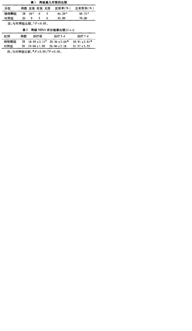 | 用法用量 | 患儿均给予常规治疗,具体包括维持正常的呼吸、循环和代谢;降低颅内压、控制惊厥等对症处理。纳络酮组加用纳络酮0.1mg/(kg·次),加入5%葡萄糖液10~30~l中静脉滴注,每8 h1次,连用3~5d(视病情而定)。 |