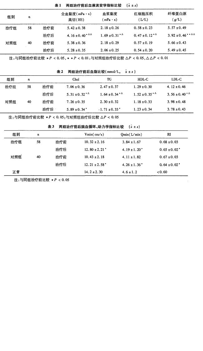 治疗组予口服疏脉益脑胶囊,每次4粒,每日3次。对照组口服脑复康,每次3粒,每日3次。两组均以3月为1个疗程,共观察1个疗程。
