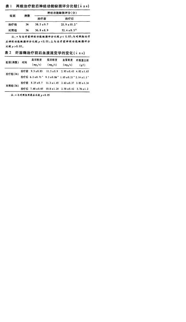 | 用法用量 | 对照组使用5%GS500ml 香丹20ml静脉滴注;治疗组在用5% GS500ml 香丹20ml静滴治疗的基础上同时给予纤溶酶200U加入生理盐水250ml中静滴,每日一次,连用14天。 |