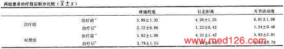 | 疗效评价标准 | 参照Hemigou等的评估标准,设立积分并进行评价。疼痛程度0分:无疼痛,无因膝关节活动障碍而出现疼痛症状:1分:轻度疼痛,疼痛与天气有关或与行走超过lO00m有关:2分:中度疼痛,行走不到IO00M即疼痛,但开始站立或负重时无疼,偶尔服用止疼药;3分:重度疼痛,开始站立或休息时疼痛,需常规服用止痛药。行走距离 (患者一次行走无疼痛的最大距离)0分:>2000M: 1分:lO00~2000M;2分:500~1O00M:3分:<500M。膝关节活动度0分:伸直0°,屈曲125°无疼痛:1分:伸直l5°,屈曲95°;2分:屈曲30°~6O°;3分:屈曲>30°。 |