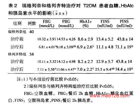 | 用法用量 | 瑞格列奈初始剂量为0.5mg,每日3次,餐前30min服药,每次根据血糖变化递增1mg,至最大剂量6mg;格列奇特初始剂量为40mg,每日3次,每次根据血糖增减40 mg。至最大剂量240mg。剂量调整稳定后,进人8周药物维持期。 |