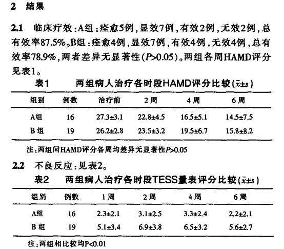 | 疗效评价标准 | 痊愈:HAMD总分≤7分,显效:减分率≥75%,有效:减分率≥50%。 |