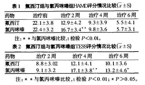 人组前征得病人同意,经过1周清洗期。治疗组服用氟西汀,开始每日早餐后10mg,以后根据情况逐渐加量,用量范围10~40mg/日,平均(20±5)mg。对照组,服用氯丙咪嗪,开始每日早餐后25mg,以后根据情况逐渐加量,用量范围75~150mg/日,平均(89±3)mg,分早、晚两次服用。疗程6周。