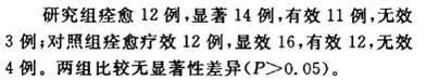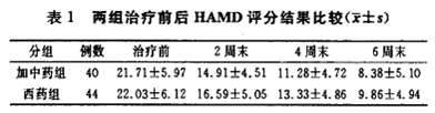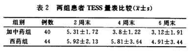 两组服药后2周末,副作用评分,两组无显著性差异(P>O.05)。而治疗后4、6周西药组均分明显高于加中药组,且差异显著(P |