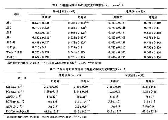| 用法用量 | 治疗组给予密盖息注射液,隔日肌注 50U,同时每日口服碳酸钙-维生素D,1片 对照组每天 给予碳酸钙-维生素D,1片 2组疗程均为6月。 |