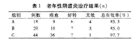 | 疗效评价标准 | (1)痊愈:自觉症状完全消失.阴道壁黏 膜呈粉红色或苍白色,阴道分泌物化验清洁变为I~Ⅱ 度。(2)好转: 觉症状减轻,阴道分泌物化验清洁度为Ⅱ~Ⅲ度。(3)无效:自觉症状光好转,阴道分泌物化验清洁度为Ⅲ~Ⅳ 度,有效率=(痊愈 好转), 治疗总数×100% 。 |