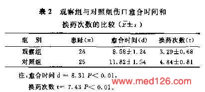 ![]() 2 伤口愈合时间和换药次数的比较 观察组与对照组的患者伤口愈合时间和换药次数的比较,见表2。 ![]() |
