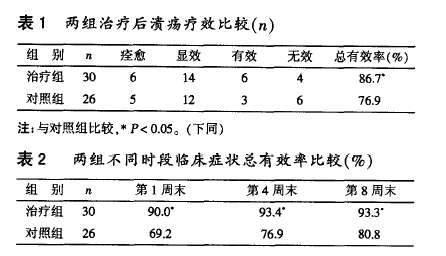 Hp根除率:治疗组的根除率为90.0% ,对照组为80.8%,治疗组明显高于对照组(P<0.05)。溃疡疗效的总有效率治疗组为86.7%,对照组为76.9%,两者比较,P<0.05。(表1)临床症状缓解率:治疗第1周末,治疗组总有效率为90.0%,明显高于对照组的69.2%(P<0.05);第4周末,治疗组的总有效率为93.4%,明显高于对照组的76.9%(P<0.05);第8周末(停药后第4周末),对照组总有效率为93.3%。明显高于对照组的80.8%(P<0.05)。(表2)