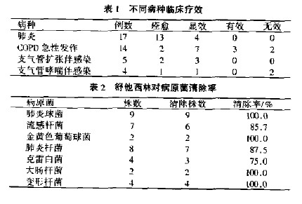 痊愈l8例(45.0%),显效15例(37.5%),有效3例(7.5%),无效4倒(10.O%) 总有效率82.5%。不同病种临床疗效见表1。治疗前后病原菌阴转情况见表2![]() 。 |