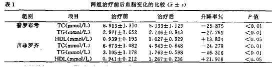 | 本研究报道不良反应 | 普罗布考组有1例出现轻度腹泻、恶心;1侧出现头晕;但未停药;2~3天后自行缓解。吉非罗齐组有1例出现轻度皮肤瘙痒;亦未停药;2~4天后自觉好转。 |
